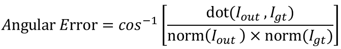 represent the RGB colorization result and the RGB ground truth, respectively. To provide a color similarity measure closer to human color perception, we also use the Angular Error (AE) defined as: