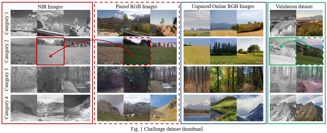 The thumbnails of the challenge dataset are shown in Fig. 1., which provideds provides both pixel-aglined NIR-RGB image pairs, and un-paired RGB images with similar scene categories. The purpose of providing both paired and un-paired RGB-NIR images is to facilitate the development of learning models that explore both pixel-level and higher-level features for efficient colorization with accurate semantic mapping and vivid color variation. Participants are encouraged to take advantage of both groups of data. While it is up to your choices not to use a certain data group provided, the use of image data from outside the dataset is not allowed for this challenge.